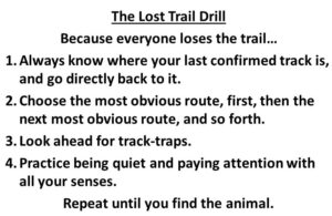 When I was recently teaching and evaluating trackers in the USA, I gave out little, wallet-sized, laminated cards for them to keep in their pockets. The cards gave away the “Secrets of Success.” The secrets are explained an exercise called The Lost Trail Drill in our online course, An Introduction to Tracking, at Tracker Mentoring. Here is what the cards said: