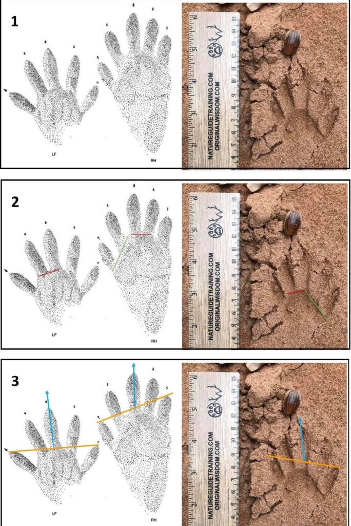The sketches above are side by side with the photo of the track. There are three rows, labeled 1, 2, and 3, cleverly enough. Row 1 is an unmarked comparison, so you can see all the features, without markup. Mark has drawn a left front foot next to a right hind foot.
