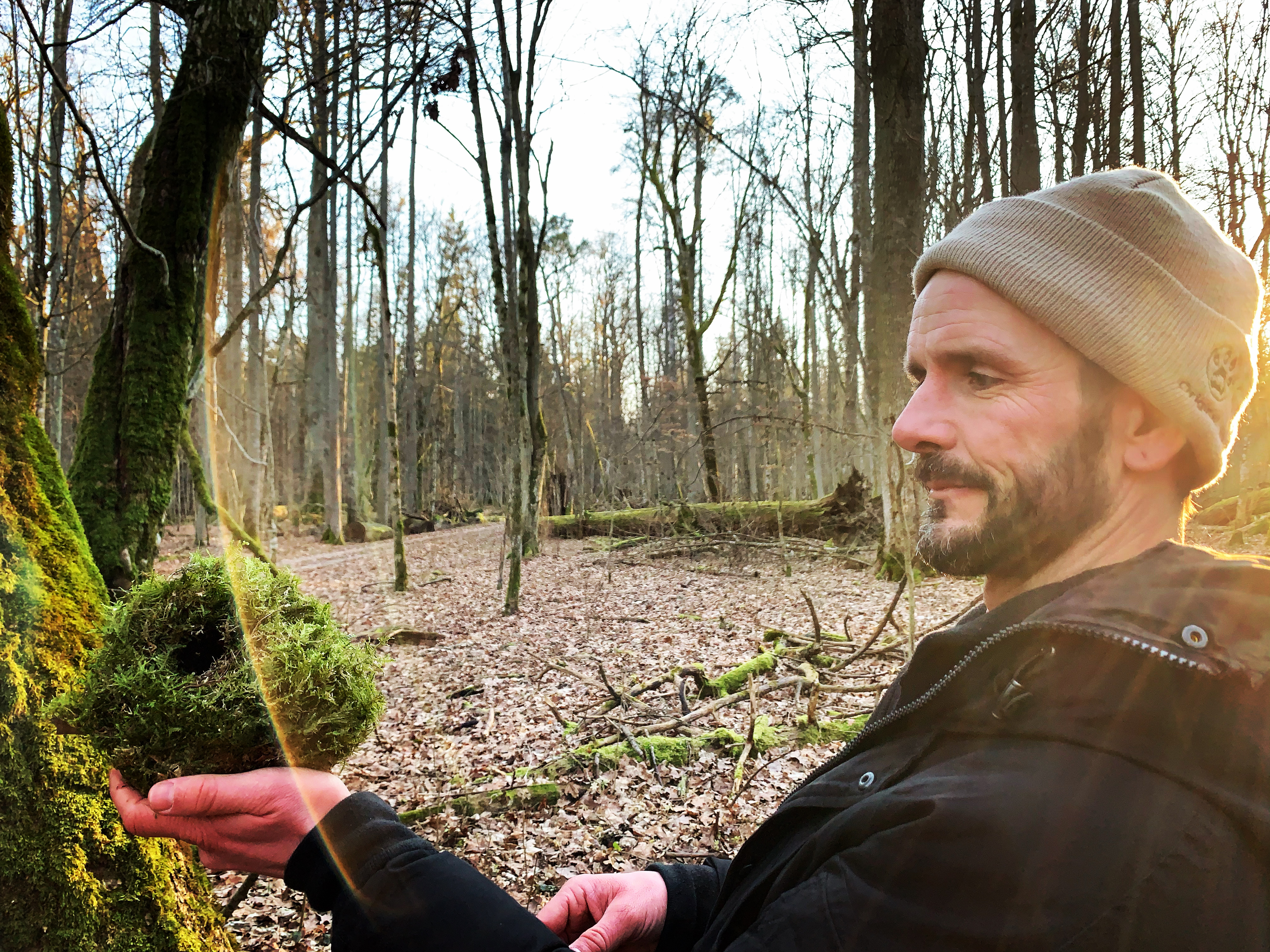 Dan Hansche holds a beautifully crafted wren nest that had fallen to the ground up to the light in Białowieża, Poland, photo by Kersey Lawrence.