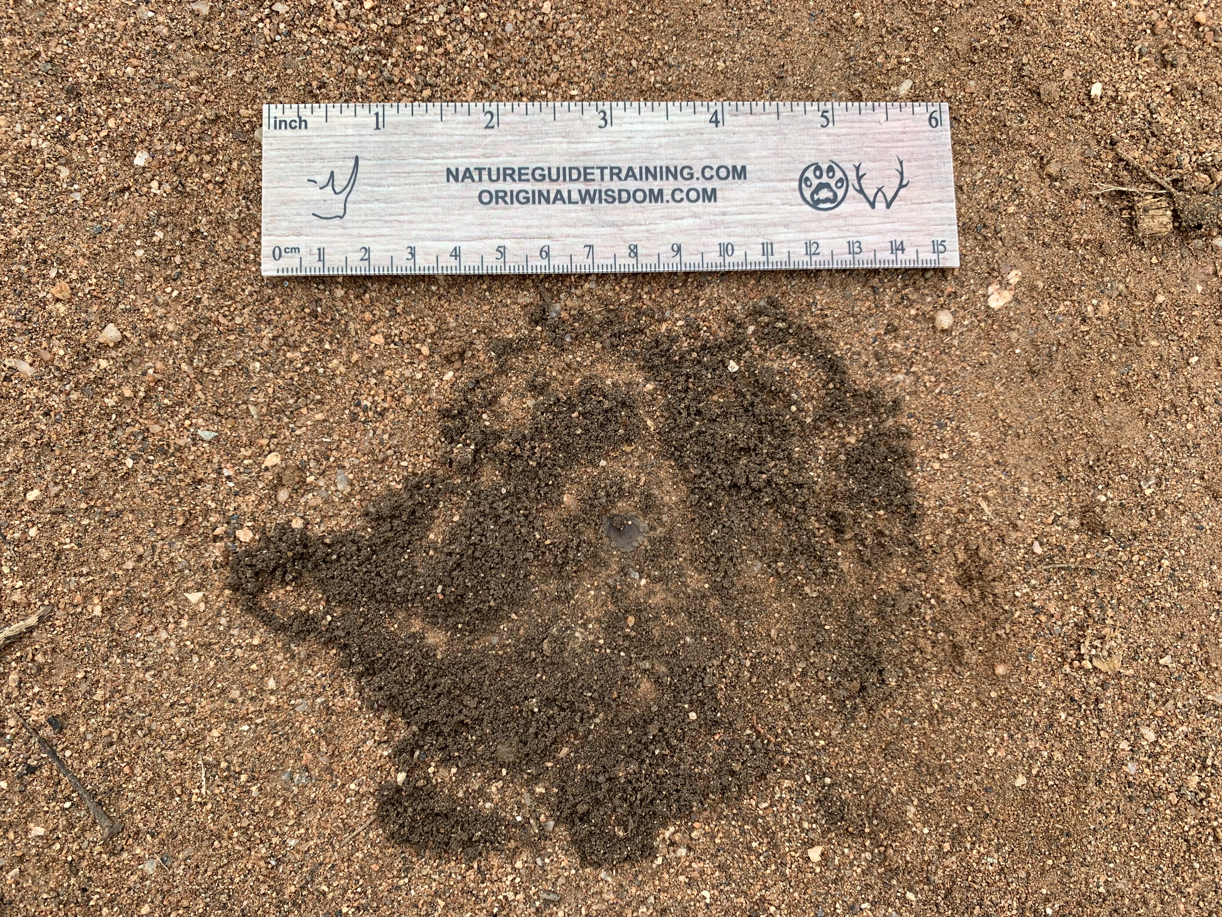 Lots of folks had some wild guesses for this little-known sign, and Margaux Mathey from South Africa answered correctly and completely: “Solifuge burrowing. Excavated soil with abdomen drag marks going in all directions, but most importantly the mud/ ‘silk’ plug. (I use the term ‘silk’ because it’s not a true spider and it doesn’t have spinnerets, yet when the plug is broken I have definitely found silk like substances… and THAT was to me the most interesting part of seeing this signs in real life).”