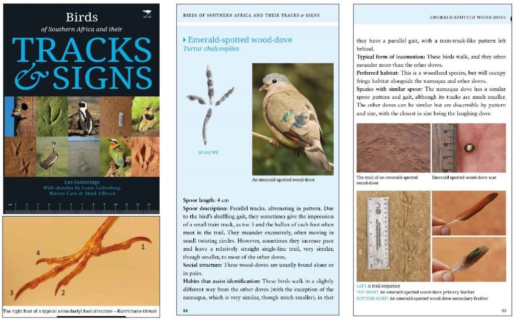 The cover of Lee Gutteridge’s new book, Birds of Southern Africa and Their Tracks and Signs (2020), along with the Emerald-spotted wood dove pages, and a diagram of the toe numbering for “regular birds, which we call an anisodactyl foot structure. Toe one is the rear-facing toe, then the numbering continues to the inside of the foot (the foot pictured is a right foot) and goes around and out.