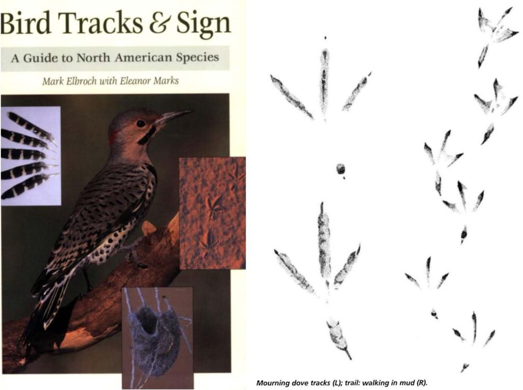 The cover of Mark Elbroch’s Mark Elbroch’s and Eleanor Mark’s Bird Tracks and Signs of North America (2001), and their illustration of classic mourning dove tracks.