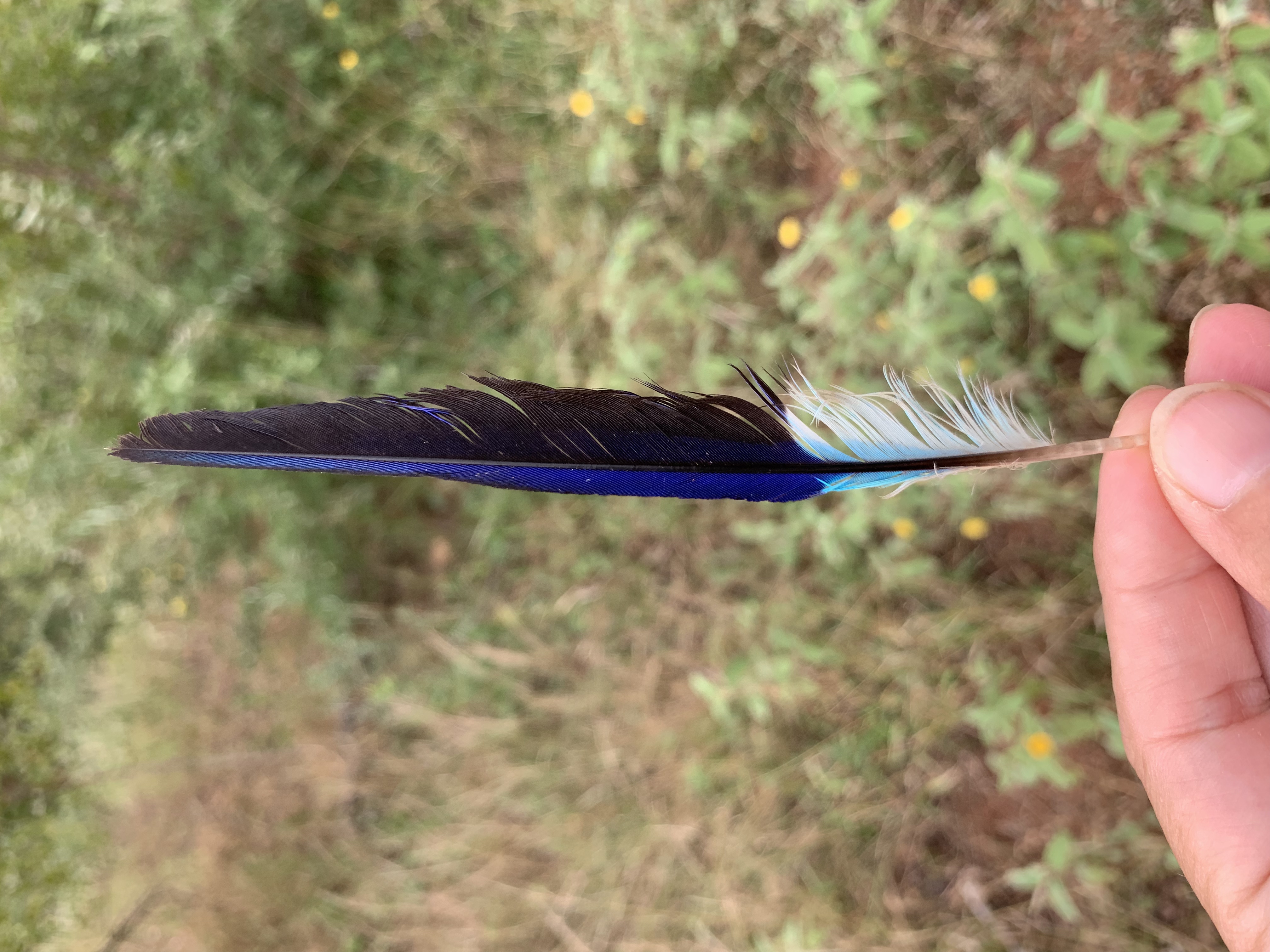 Mark Apgar (USA) Looks like a primary feather from the right side (I’d guess it was the 2nd or 3rd from the front). Bird appears to be blue jay sized (although clearly not a blue jay). If only there were a regional feather guide I could look it up in! (Mark jests, because Lee and I are currently gathering feathers and writing one! We have the feathers from a lilac-breasted roller, which match this one as P9, but don’t yet have a European roller for comparison.)