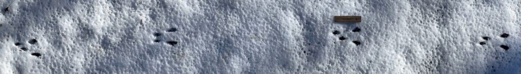 This is a bounding pattern of a grey (or gray) squirrel. In the mostly deciduous habitat that this panoramic photo was taken in, they are the only squirrel species present. The size of the tracks are also too big for a red squirrel. Squirrels are rodents, and in Connecticut we do get red squirrels, but I have never seen one in that area. There are, of course, Eastern chipmunks, which are much smaller, and also New England cottontails that make similar track patterns. In each group of 4 feet, here, the front tracks are on the left and the hind tracks are on the right, the animal is moving from left to right. The front feet land (mostly) together, and then the hind feet come over and around the front feet as they gather and leave the ground and the animal bounds forward. In lagomorphs, like the cottontail, the front feet are usually more staggered, one after the other, not side by side, and the animal is narrower, proportionally. Squirrels are chunky little things with wide butts, while rabbits are slender and streamlined. You usually don’t get a lot of detail in squirrel tracks because they are very furred, while squirrel paws are “naked” and, in better photos, you can make out individual toes, pads, claws, etc.