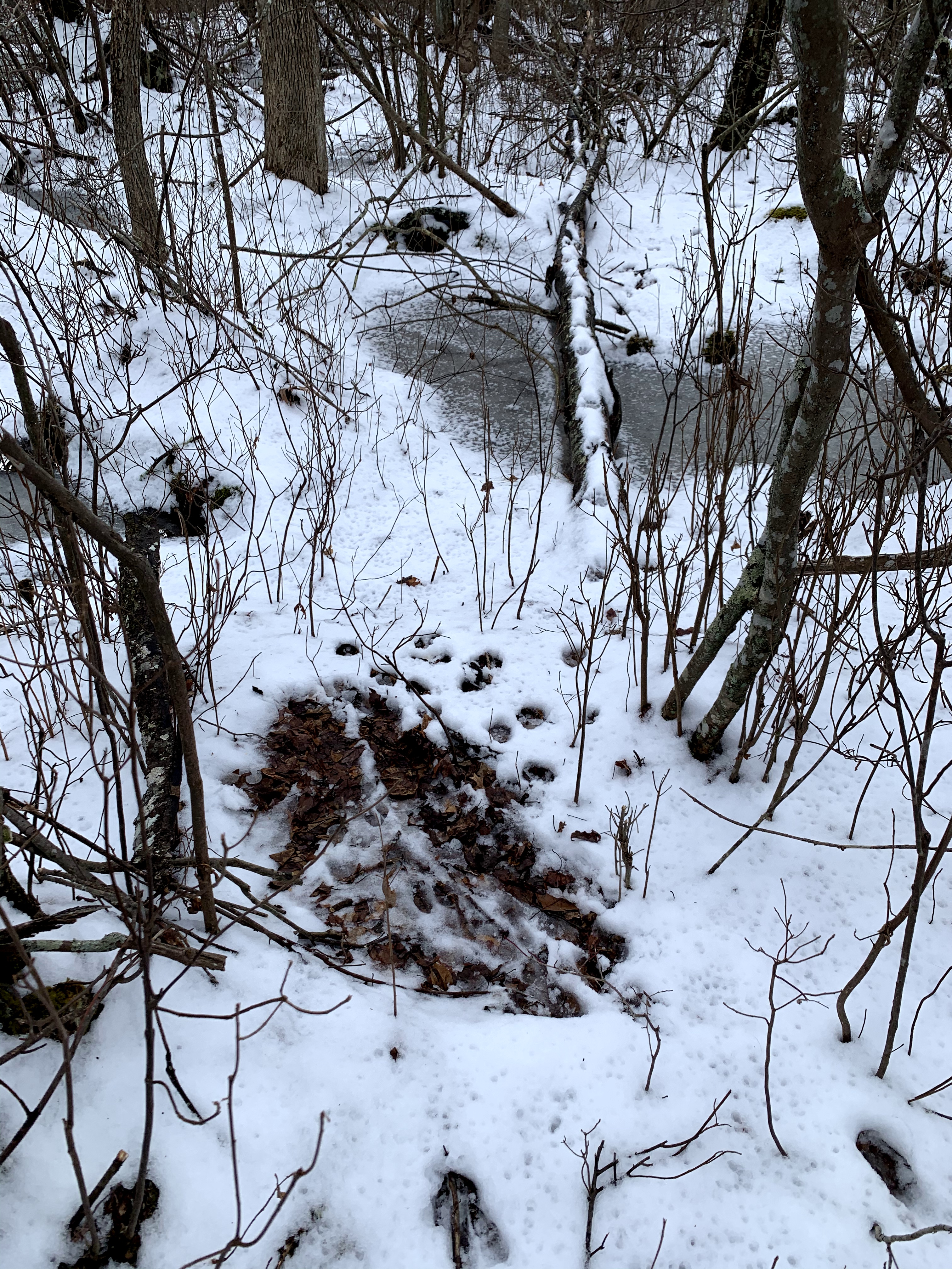 This was one of my favorite trails from last January. I was following a bobcat, which went into one of the many deciduous swamps in Connecticut. The cover became thick, and I could not see far ahead, so I slowed way down and stopped frequently to listen and use my senses. I was hopping from one “island” to another when I was busted by 4 snorting deer, who took off at a run. Knowing that they would circle to get a better scent from me, I headed across their trail to head them off. I walked directly to this bed, still warm, with deer tracks heading out of it, and my bobcat, too, across a fallen log (one of their favorite places to walk). It was winter, and even though winters in Connecticut aren’t that cold, and the snow wasn’t that deep, I decided to let the deer go, and continued trailing the bobcat.