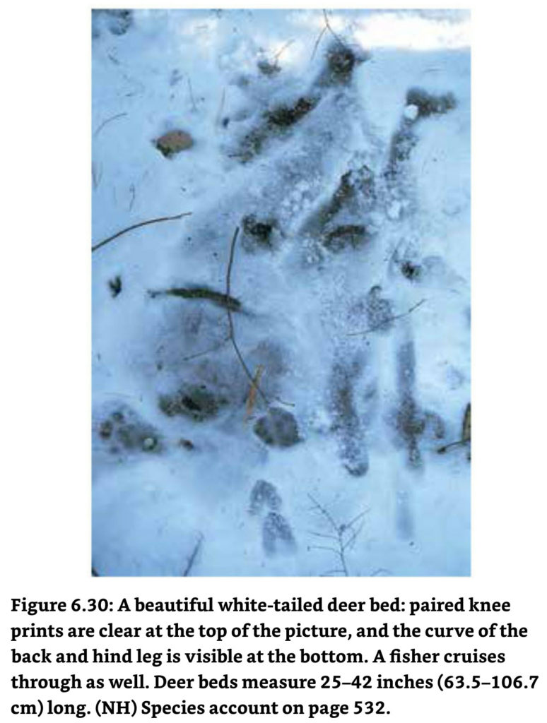 I think he’s right about the direction, especially if we compare to the photo in Mark Elbroch’s Mammal Tracks and Sign, below. We can see the curve of the back on the left, and the shallower snow towards the bottom of the photo, where the impression of the deer’s body comes to a point. The back end (top of the bed in the photo) is wider, and I think we can see suggestions of the legs to the right. If I remember correctly, the bed was on a slight hill, too, overlooking the interior of the swamp, and I think it would have been uncomfortable for the animal to lay with it’s back on the downhill side.
