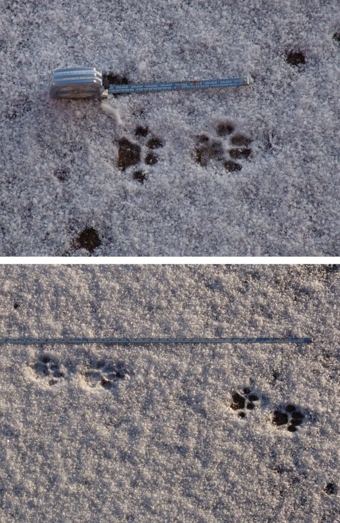 Paul Glasser (USA) gave a comprehensive answer to these photos, it’s a domestic cat. You can scroll back and compare it to the African wildcat tracks from earlier in the week, Paul said, “Domestic cat overstep walk. These are feline tracks because of the asymmetric arrangement of toes around the heel pad, and because the heel pad shows three in the rear. I‘m calling it a domestic cat (although could be juvenile bobcat) because the tracks are too small for adult bobcat. In the first photo the track on the left is right front and the track on the right is right hind. These are right tracks because the leading toe is on the inside. The track on the left is front because it is blockier amd more round than the hind. Correspondingly, the track on the right is hind because it is more oval. Also, felines commonly walk with an overstep. In addition, I will go out on a limb and apply Elbroch’s criteria for sexing cougar tracks (p.22 2nd. ed.) and call this is a male because the front track is wider than long, while the opposite is typically true for the female frront track. This is also true for bobcats so from my view out on a limb I speculate that it is true for domestic cats as well. Maybe someone can confirm one way or the other? The second photo, from left to right, is LF, LH, RF, RH, by the same reasoning as above.”